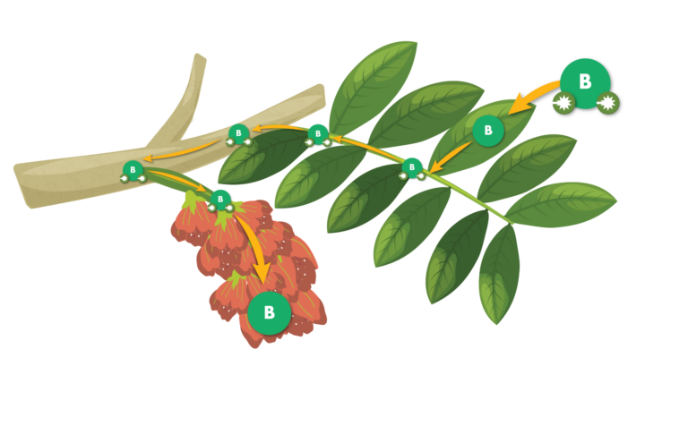 Boron is essential for pollen tube elongation and plays a critical part in the polymerization of cellulose and lignin fibers. Where calcium is the cement between cells, boron is the rebar that strengthens it. It is critical for cell elongation and for the strength of cell walls. Studies show that foliar applications of boron before bloom lead to improved fruit set and yield. One boron solution is BoronBoost®, built with Transit® biostimulant for improved boron mobility within the plant, which is shown to support pollination for improved nut set and yield.
