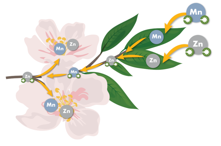 Bloom and early fruit and nut set are the most critical periods for setting and retaining fruit and nuts. Nutrients like zinc, boron, and calcium are critical for pollen tube elongation and ultimately help ensure the success of pollination and fertilization.